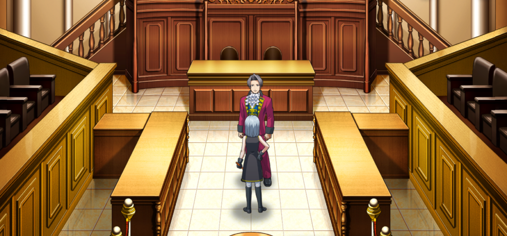 右の扉から地方裁判所 第3法廷へ行き、「弁護席」「検事席」「裁判長席」をすべて調べると獲得できます。