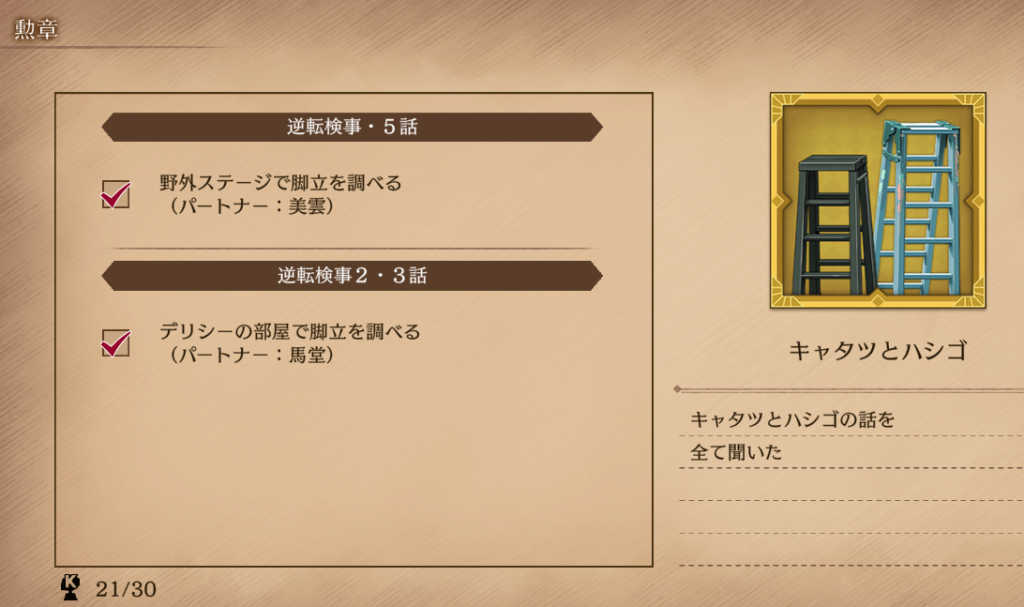 また、逆転検事2 第3話「受け継がれし逆転」 前編「デリシーの部屋の捜査」から始めると、同時に実績/トロフィー「ハシゴとキャタツ」の条件も1つ満たせます。