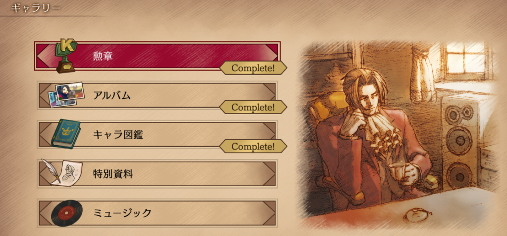 逆転検事・逆転検事2クリアすればギャラリーの「アルバム」「キャラ図鑑」の項目が100%になっているはずです。