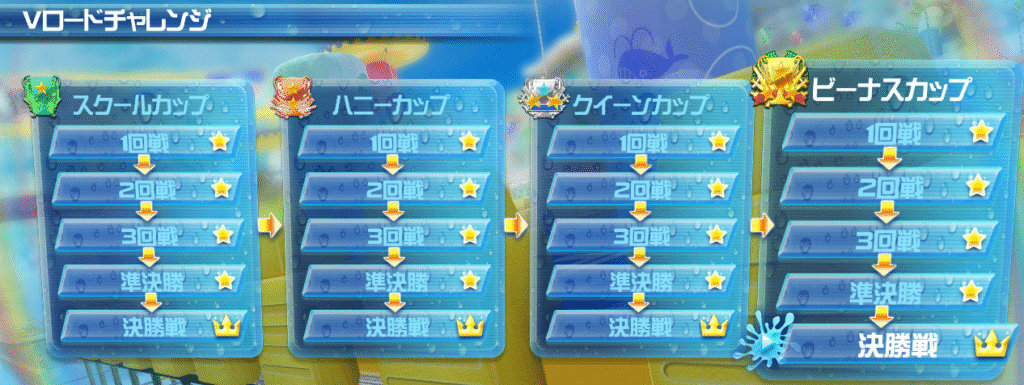 Vロードチャレンジに存在する4つのカップ戦「スクールカップ」「ハニーカップ」「クイーンカップ」「ビーナスカップ」で優勝しましょう。