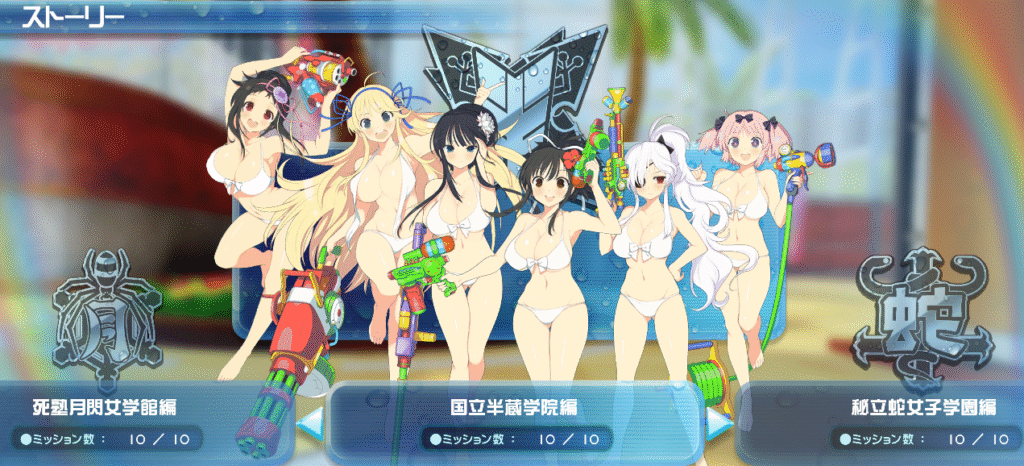 国立半蔵学院編」「焔紅蓮隊編」「死塾月閃女学館編」「秘立蛇女子学園編」の4つがあり、全てクリアすると「P1クライマックス編」が出現。